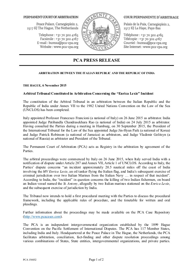 Months after the ITLOS Order on the “Enrica Lexie” Incident has been delivered (see post), the Permanent Court of Arbitration just announced that the constitution of the Arbitral Tribunal in an arbitration between the Italian Republic and the Republic of India under Annex VII to the UNCLOS has been completed. Information on the appointed arbitrators can be found in this press release.