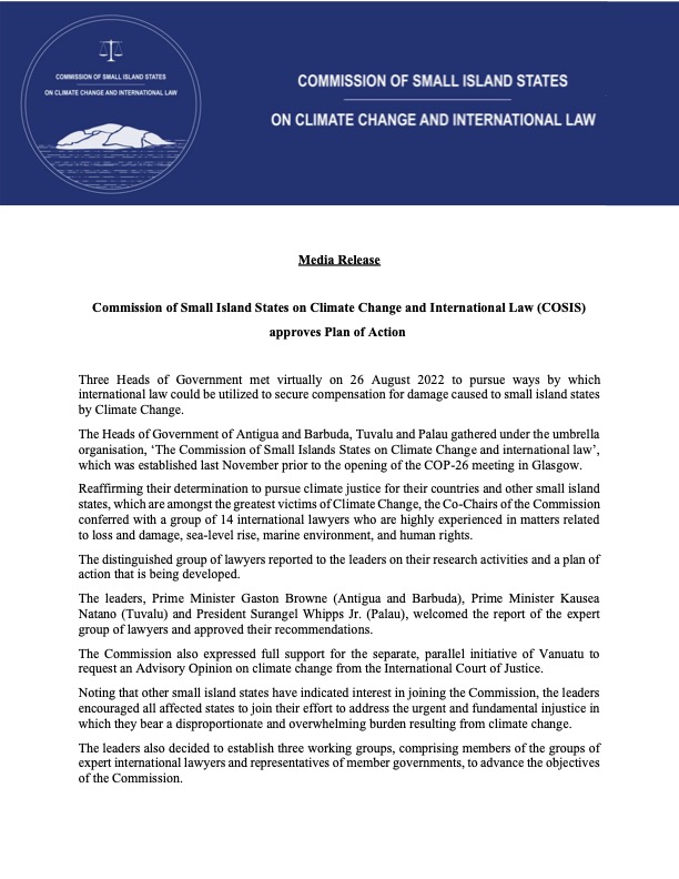 On 26 August 2022 the Commission of Small Island Developing States on Climate Change and International Law (current composition: Antigua and Barbuda, Tuvalu and Palau; previously reported) met virtually, including conferral with 14 appointed international experts and advisors (ACOSIS, Art. 2(3)) and approval of their recommendations in a “plan of action that is being developed”. COSIS may consider and request an advisory opinion from the International Tribunal for the Law of the Sea (ACOSIS, Art. 2(2)), but during the meeting COSIS decided to also express full support (ACOSIS, Arts 1(3), 2(1)) for the separate Vanuatu initiative to Seek an ICJ advisory opinion on climate change through a UN General Assembly request (previously reported). Finally, three COSIS working groups were established (ACOSIS, Art. 3(4)) to “advance the objectives of the Commission”. The focus of each working group is not defined, although 3 thematic topics are evident when reading ACOSIS Arts 1(3) and 2(1). For more information see the COSIS Press Release (2).