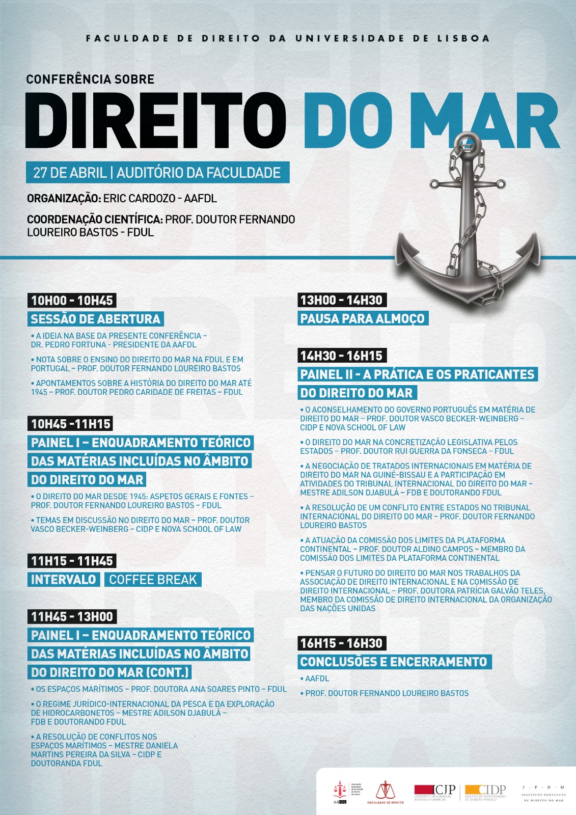 The Faculty of Law at the University of Lisbon is hosting a conference entitled “Direito do Mar” (Law of the Sea). This event will include presentations on the teaching and history of the law of the sea in Portugal, maritime spaces and conflict resolution. It will also include a panel featuring experiences of practicioners. The event takes place on 27 Abril 2023 in Lisbon (Portugal). More information can be found here (in Portuguese).