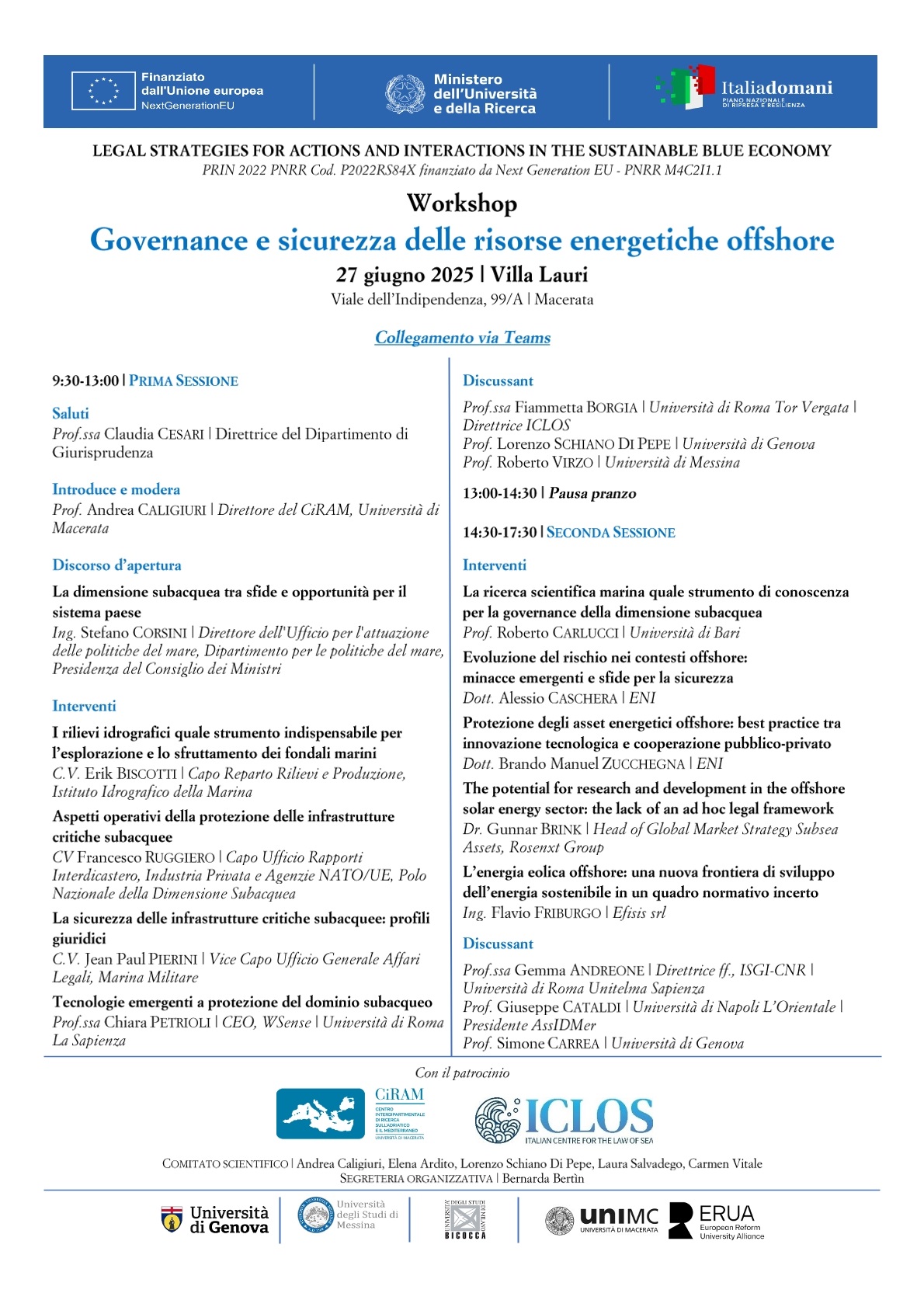 The Centro interdiparimentale di Ricerca sull’Adriatico e il Mediterraneo (CiRAM) and Italian Center for the Law of the Sea (ICLOS) will host a conference, entitled, Governance e sicurezza delle risorse energetiche offshore, 27 June 2025, in a hybrid format (University of Macerata (Italy)/Online (Teams)). For more information see here.